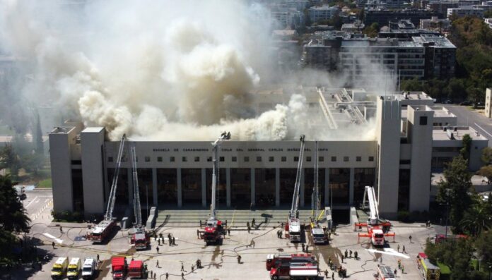 El incendio que afecta a la Escuela de Carabineros en la comuna de Providencia, región Metropolitana, habría sido provocado por el uso de un soplete.