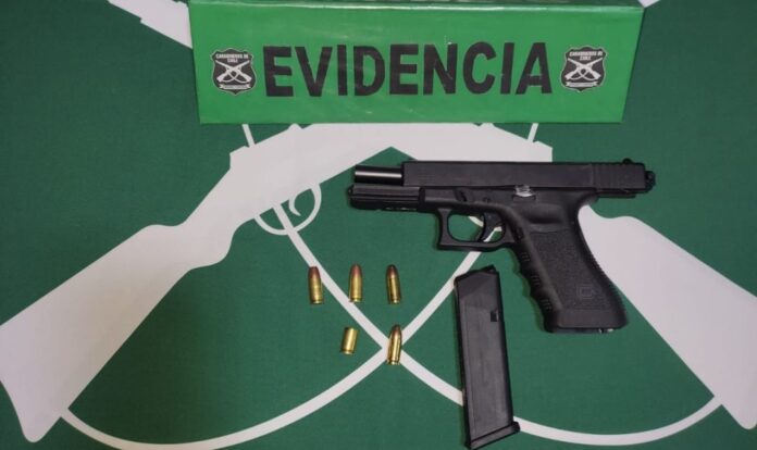 Al descender para verificar la situación, se notó que del cinto del acompañante cayó un arma de tipo pistola, que fue identificada como una Glock 17 automática, con el número de serie borrado, y que contenía cinco cartuchos. Se procedió a la detención de los involucrados.