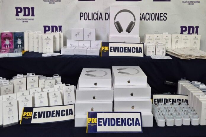 Detectives de la Brigada Investigadora de Delitos de Propiedad Intelectual (Bridepi) de la PDI llevaron a cabo una serie de allanamientos en varias tiendas del centro de Santiago, incautando un total de 1.923 accesorios electrónicos para celulares que pretendían imitar productos de una reconocida marca.