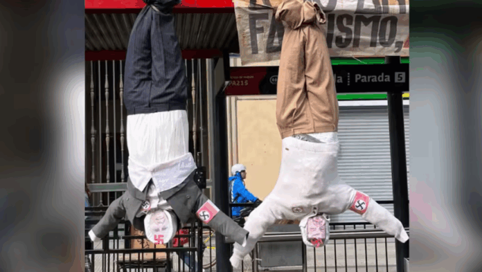 Una publicación difundida por las Juventudes Comunistas (JJ.CC.) de Santiago ha generado gran controversia. En la imagen, dos muñecos con las caras de los candidatos presidenciales José Antonio Kast y Johannes Kaiser eran colgados de los tobillos frente a La Moneda, con brazaletes que simulaban esvásticas nazis, haciendo alusión a las ejecuciones públicas de Benito Mussolini y sus seguidores.
