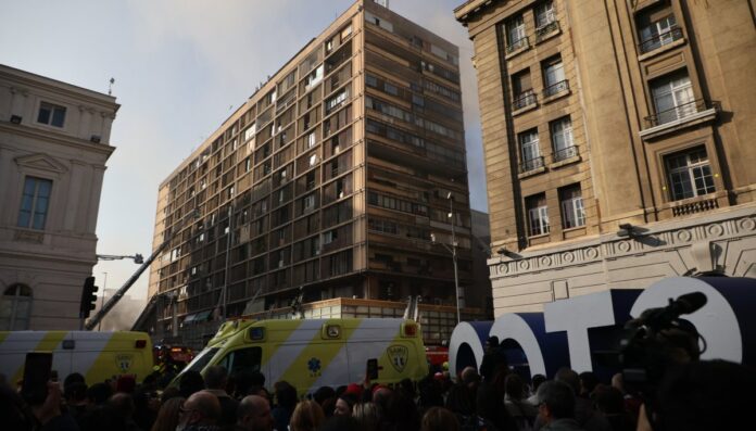 Los bomberos no han podido acceder al foco del incendio en el antiguo edificio de los cines Mayo y Nilo, ubicado en Monjitas con 21 de Mayo, cerca de la Plaza de Armas de Santiago.