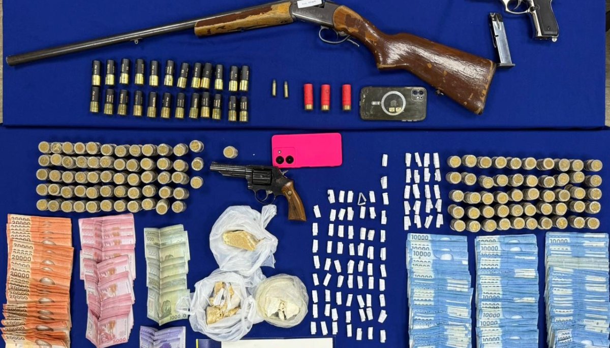 En una de estas propiedades, la PDI confiscó 250 gramos de pasta base, un revólver, un arma de fogueo, municiones y más de 6 millones de pesos provenientes del tráfico de sustancias ilegales. En otras ubicaciones, se incautaron una escopeta, más municiones y más drogas.