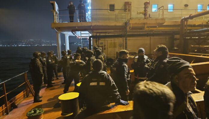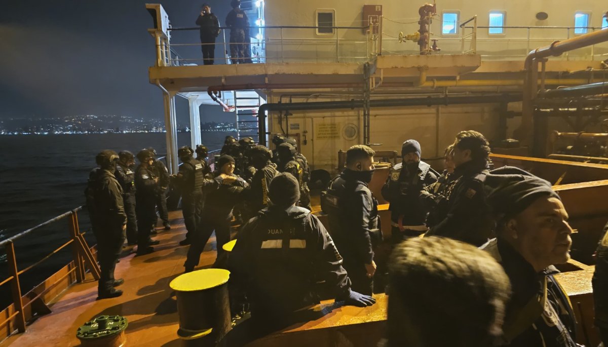 El procedimiento de inspección se llevó a cabo mientras el buque se encontraba en la bahía porteña, por lo que los equipos de fiscalizadores y marinos se trasladaron a bordo de lanchas de la Armada para alcanzar la embarcación.