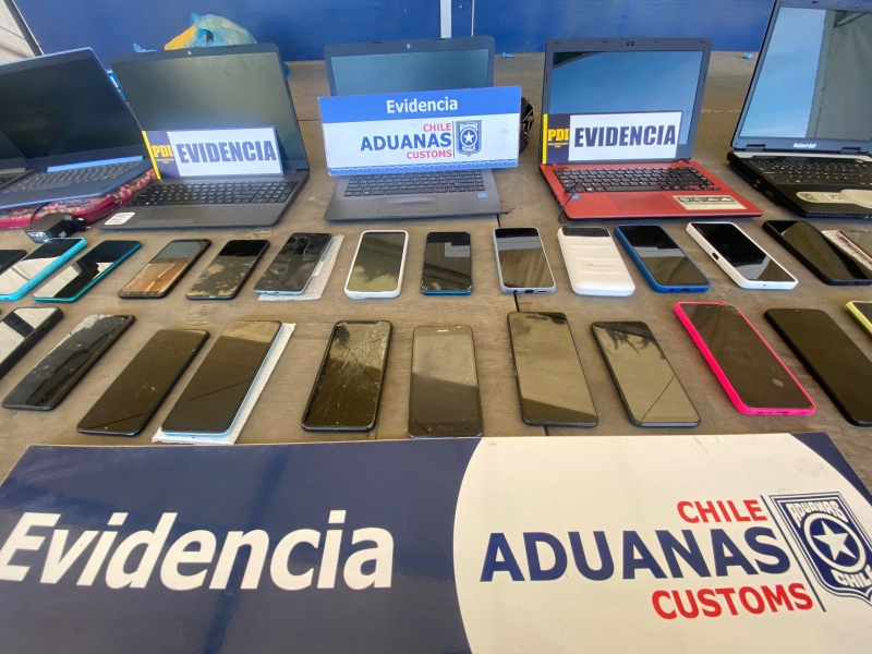 Sin embargo, durante el examen físico conjunto de las mercancías realizado por Aduana y la PDI, se encontraron numerosos bultos que ocultaban decenas de celulares, notebooks y tablets.