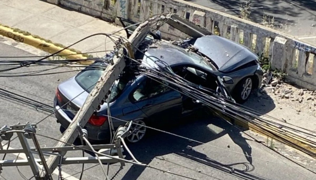 Un vehículo colisionó y derribó varios postes de la línea eléctrica en Valparaíso, en la tarde de este jueves.